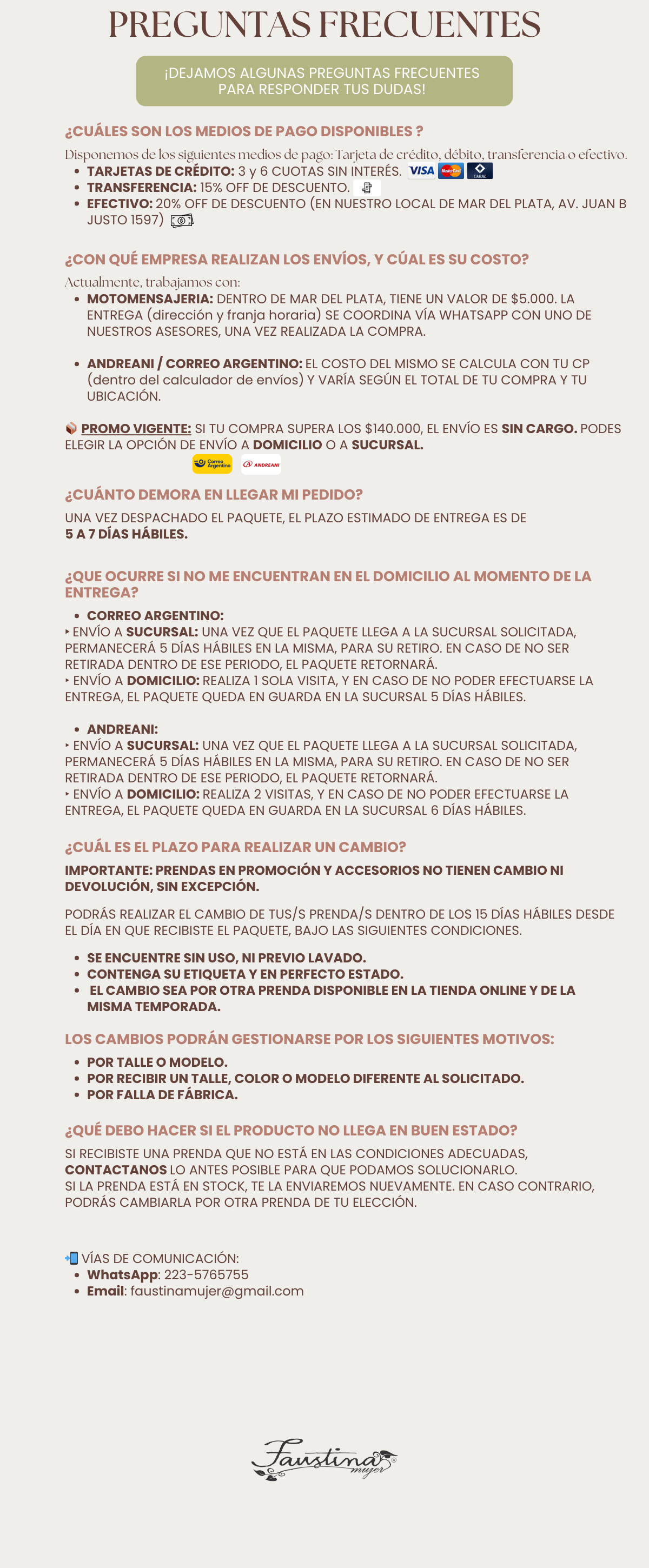 Faustina Mujer - Juan B. Justo 1597, Mar del Plata. De Lunes a Sábados 10:00 a 18:00 hs | Domingo cerrado ¡Te avisaremos por Whatsapp cuando tu paquete esté listo!
