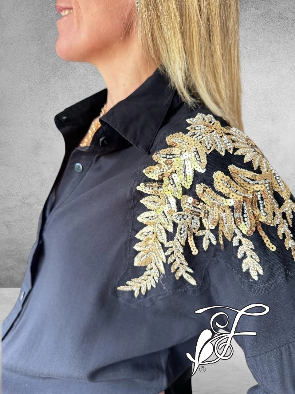 Descubrí la elegancia de nuestra Camisa Bordada, confeccionada en fibrana rayon para un calce liviano y suave. El detalle destacado: un delicado aplique bordado de lentejuelas en los hombros, que aporta brillo y sofisticación a cualquier look.