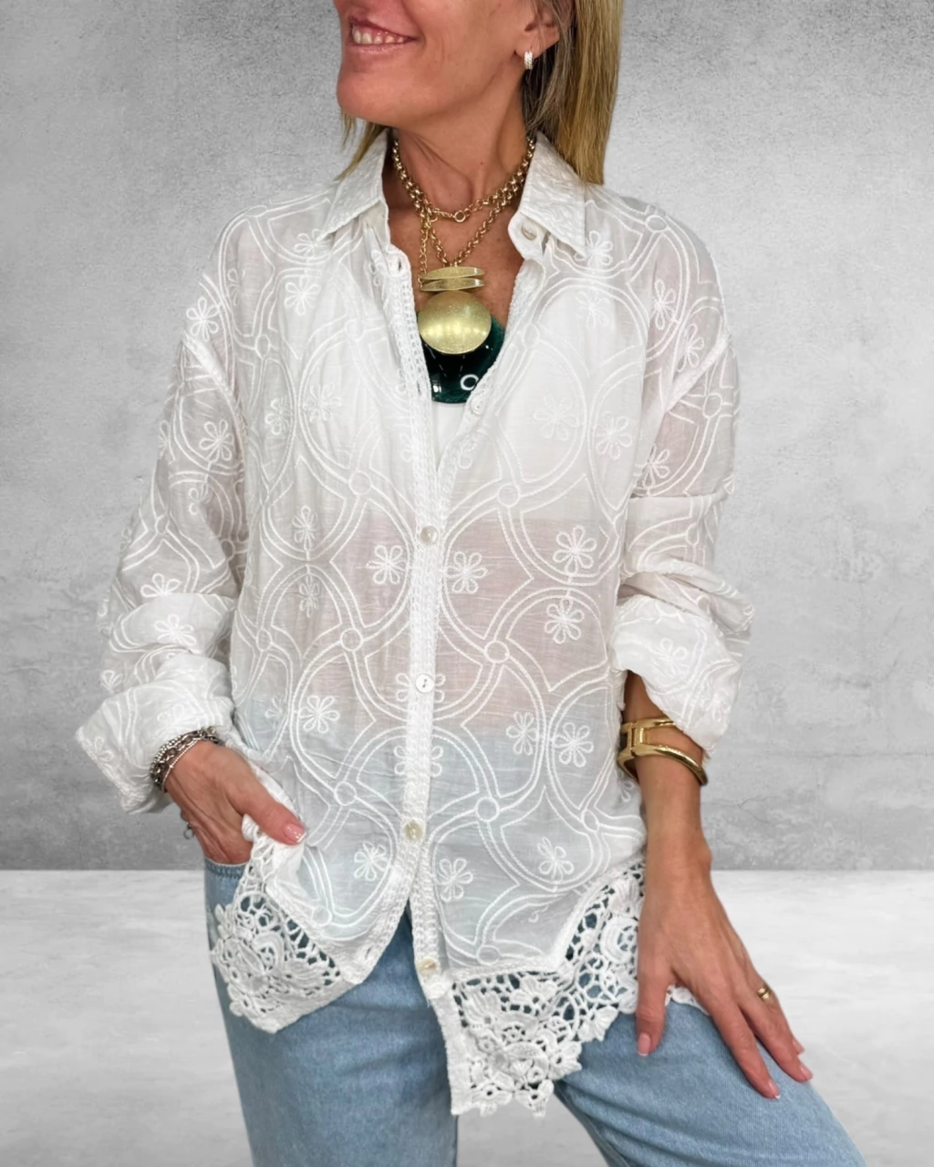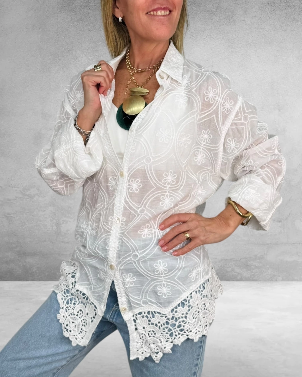 La Camisa Miranda es una camisa manga larga de broderi, ideal para sumar elegancia y frescura a tu guardarropa. Confeccionada en delicado broderi de alta calidad, su diseño combina la sofisticación de los detalles calados con la comodidad de una prenda liviana y versátil. Es perfecta para armar looks casuales o elevar tus outfits diarios, aportando un toque femenino y romántico.
