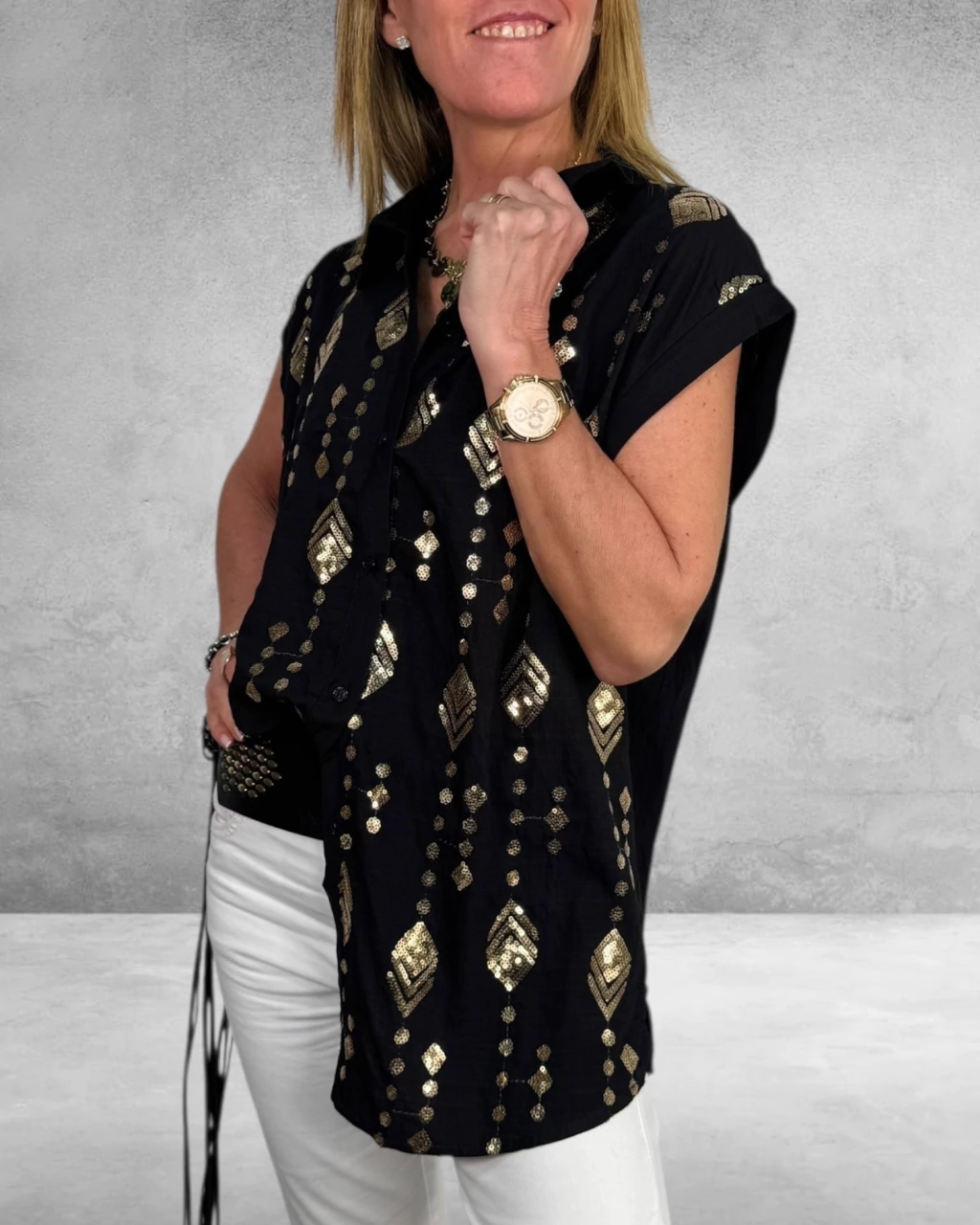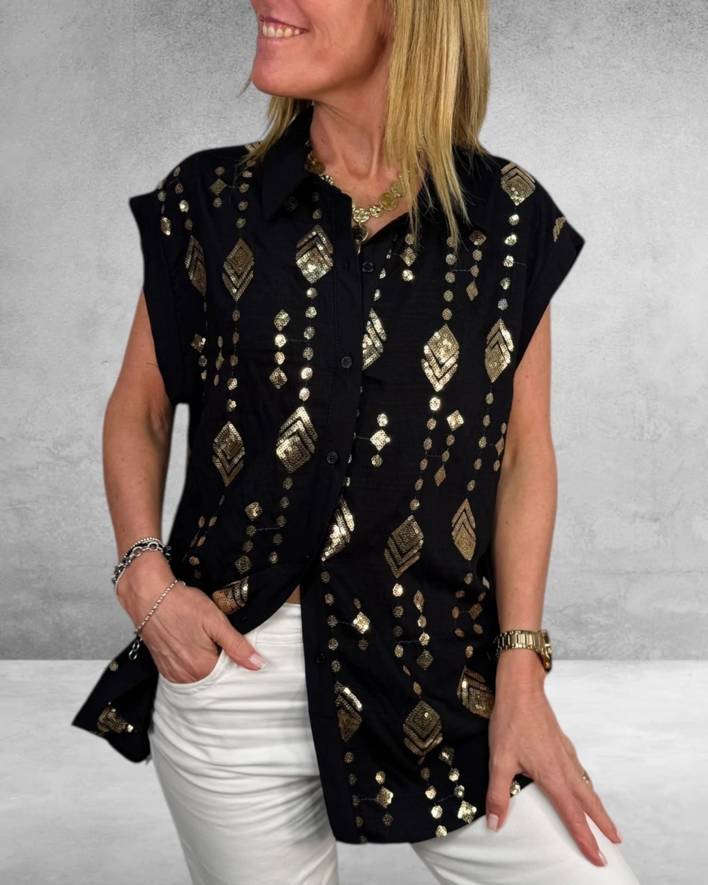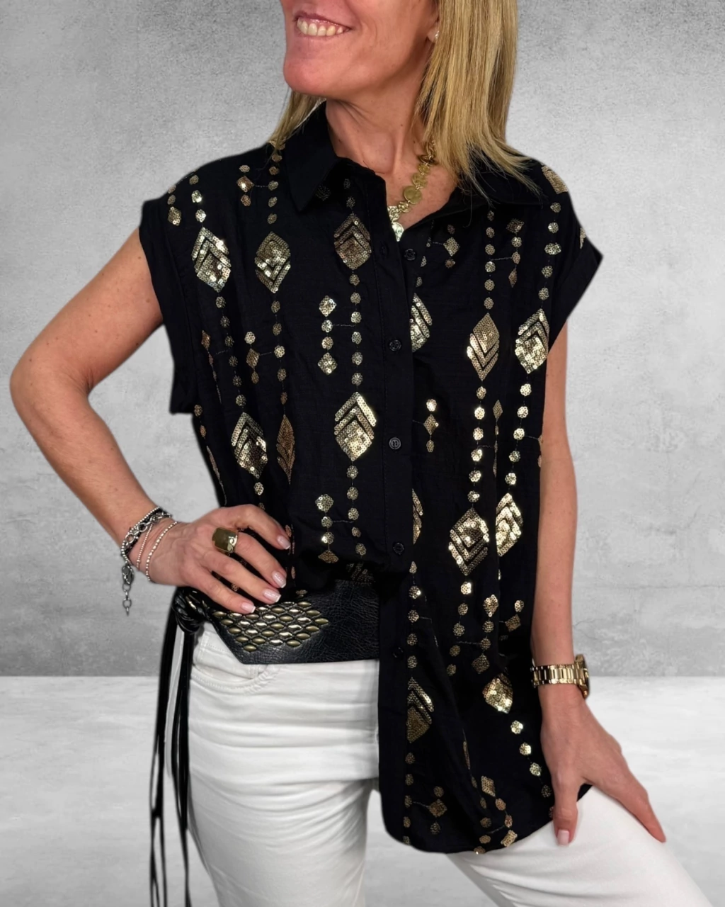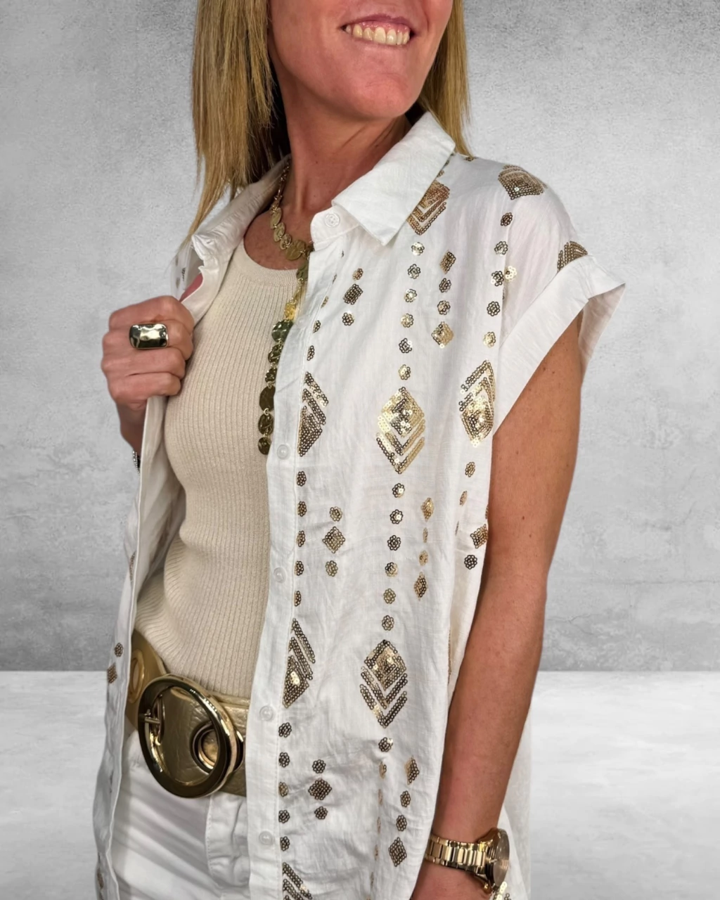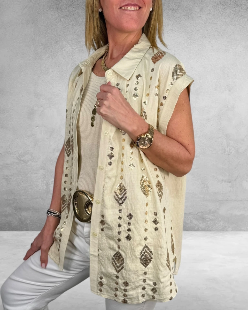 La Camisa Vera es sinónimo de sofisticación y frescura. Confeccionada en lino liviano, destaca por su bordado en lentejuelas en la delantera, aportando un brillo sutil y elegante. Su diseño de manga corta y botones la hace ideal para lucir cómoda y chic en todo momento. ¡Sumá un toque especial a tu guardarropa!