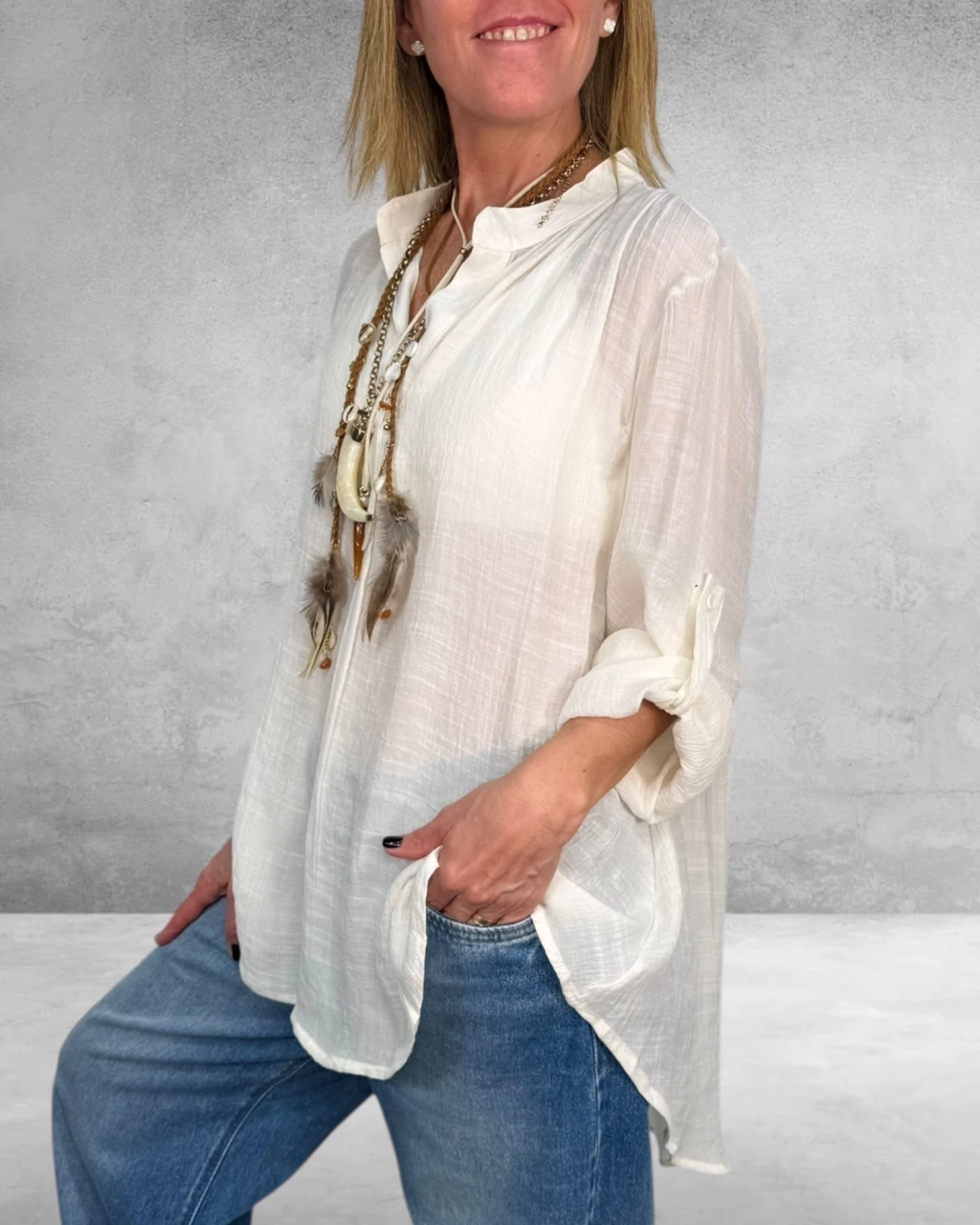 La Camisa Lina es una elegante camisa de gaza con cuello mao y botones en su delantera, perfecta para lograr un look sofisticado y liviano. Su diseño atemporal y tejido vaporoso realzan cualquier outfit, ideal para el día o la noche.