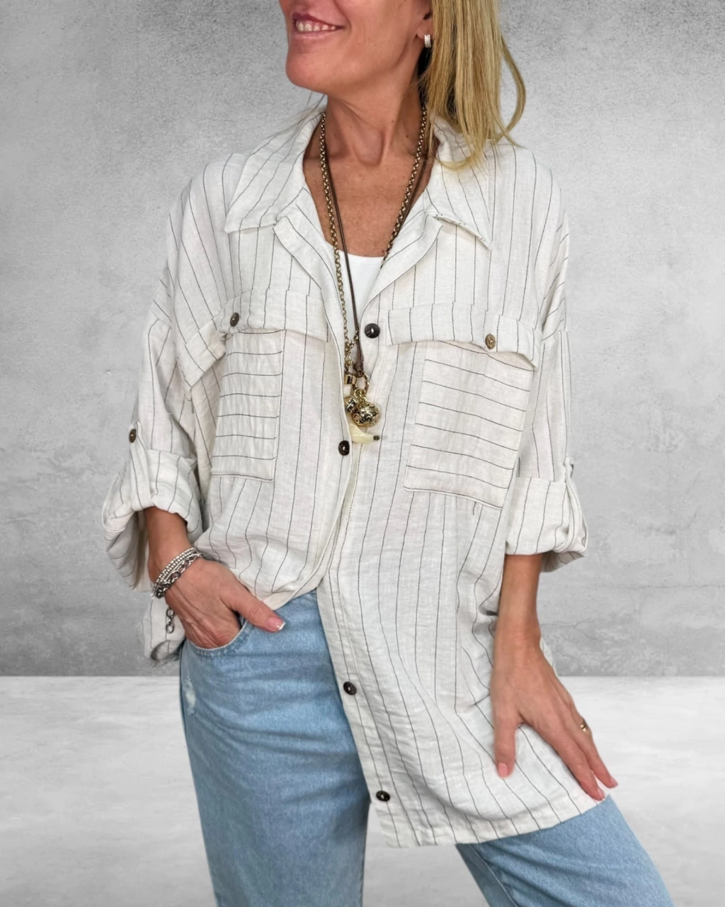 La Maxi Camisa Dominga es una prenda imprescindible para tu guardarropa, confeccionada en lino de alta calidad, ideal para lucir fresca y cómoda durante todo el día. Su diseño rayado aporta un toque moderno y sofisticado, mientras que los bolsillos delanteros funcionales suman practicidad y estilo a la vez.