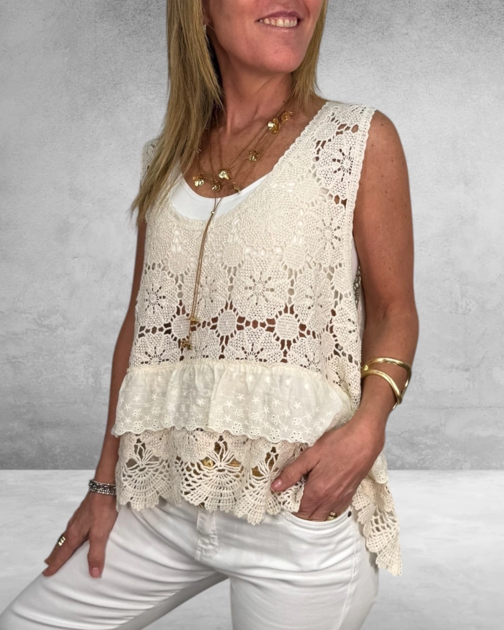 La Muscu Crochet Mery es la opción ideal para quienes buscan un look delicado. Confeccionada en crochet, esta musculosa se destaca por su detalle de volado en broderie sobre la cadera, aportando un toque romántico. El cuello redondo realza la silueta y la convierte en una prenda versátil,.