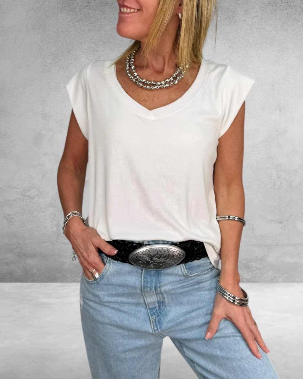 La Musculosa Ornella es una prenda básica y atemporal de Morlei, ideal para sumar a tu guardarropa y combinar en cualquier ocasión. Confeccionada en materiales de alta calidad, esta musculosa se destaca por su cuello en V y un delicado detalle en sus mangas, que aporta un toque femenino y elegante.