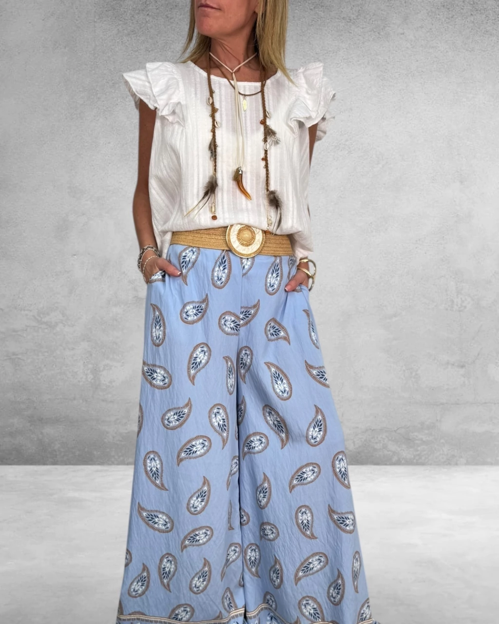 El Palazo Arabia es un maxi palazo confeccionado en tela cey y fibrana, lo que le aporta suavidad, caída liviana y gran comodidad. Su elástico en la cintura asegura un calce adaptable.
