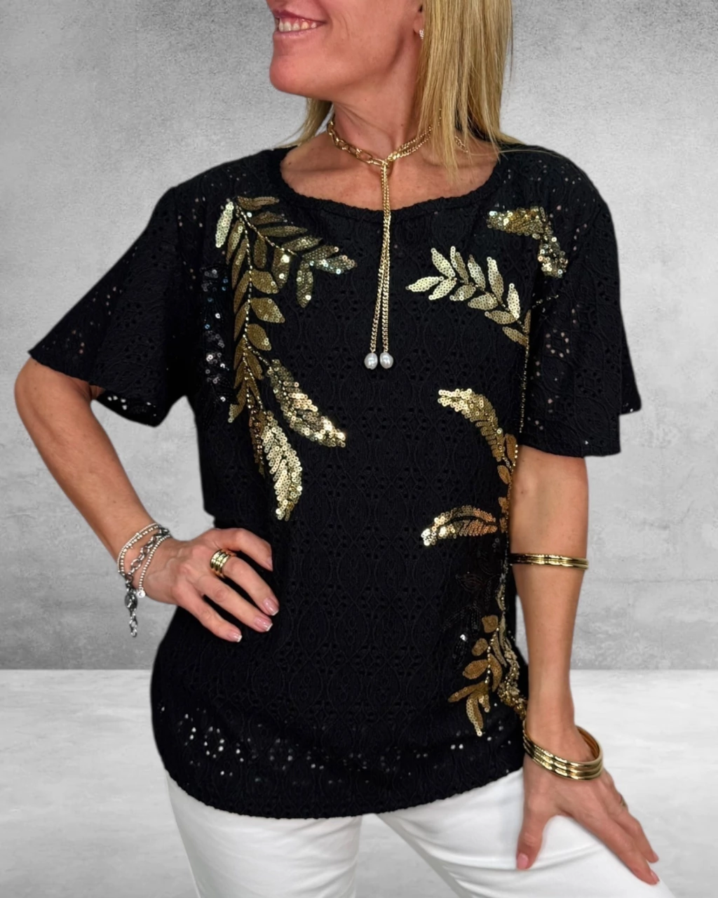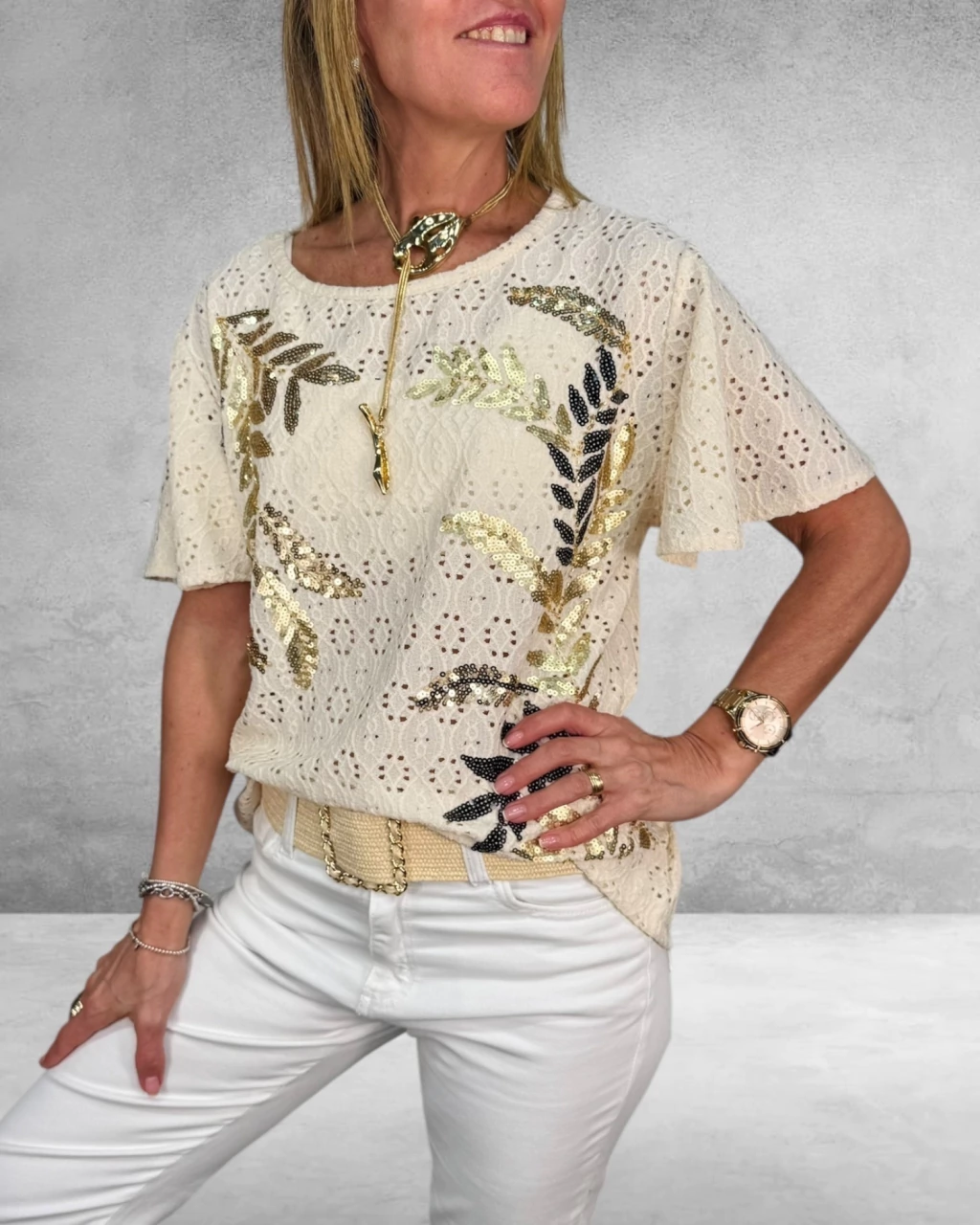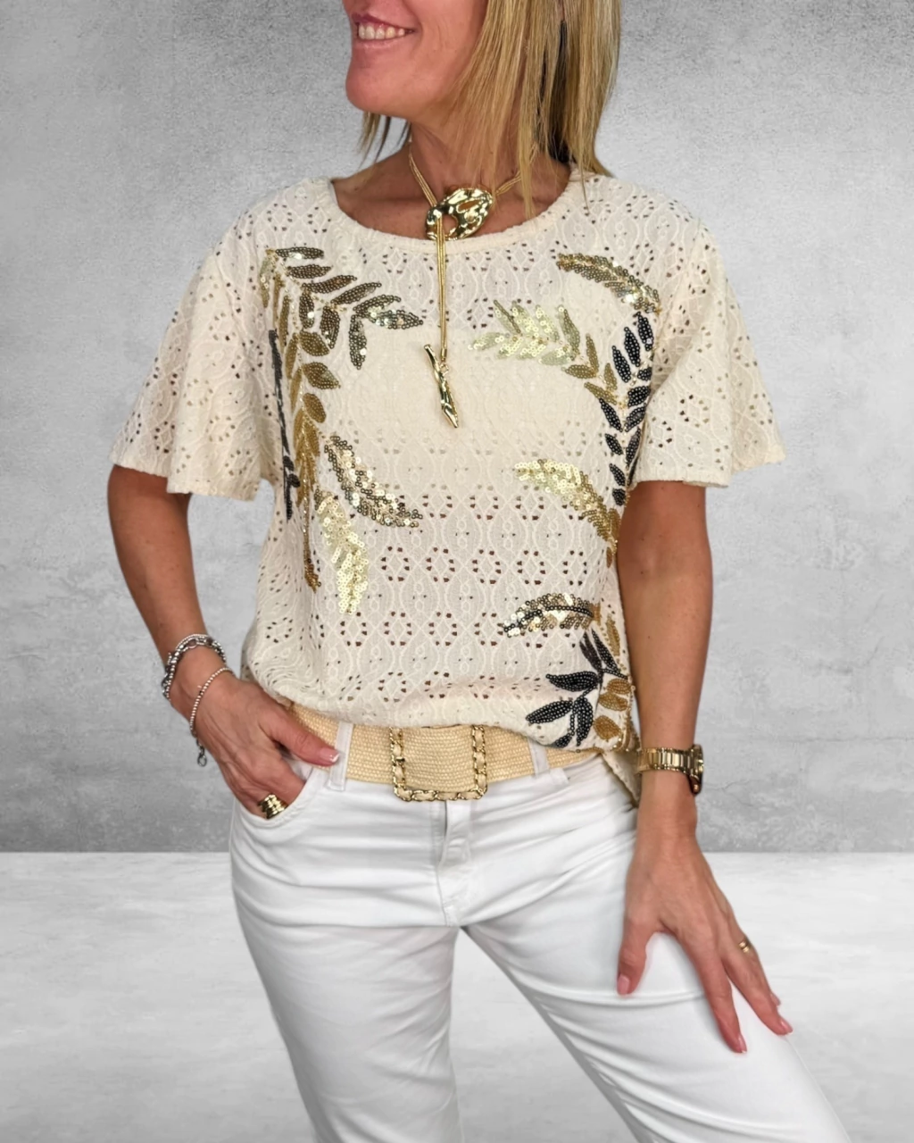 La remera de broderi con lentejuelas bordadas y cuello redondo es la combinación ideal de elegancia y originalidad. Confeccionada en delicado broderi, esta prenda se destaca por su textura detallada y el brillo sutil que aportan las lentejuelas cuidadosamente bordadas a mano. Su clásico cuello redondo realza el rostro y suma versatilidad, permitiéndote usarla tanto en looks diarios como en ocasiones especiales.