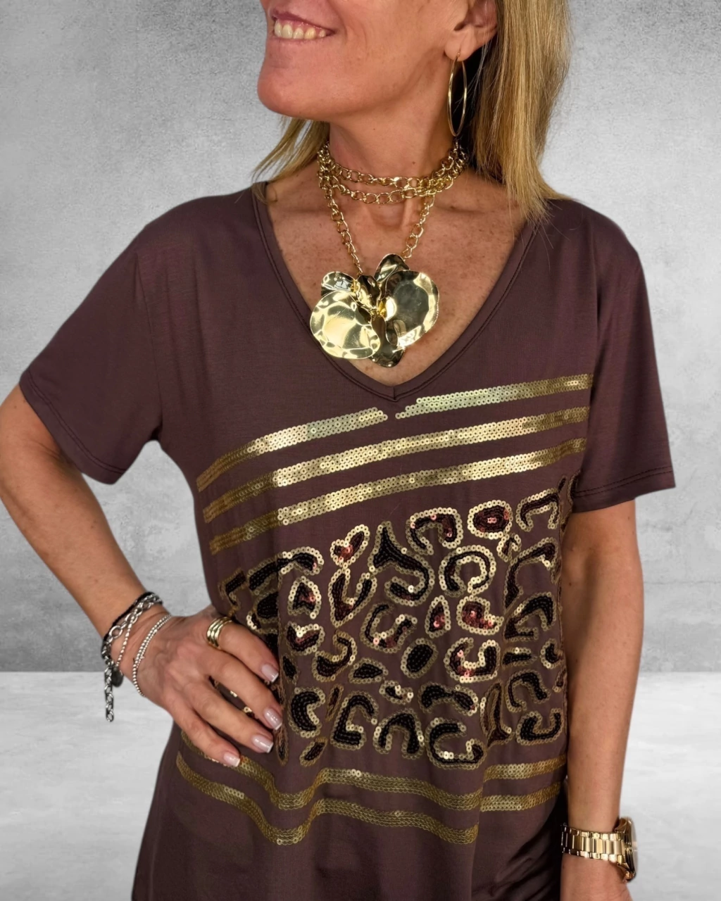 La Remera Print es la elección perfecta para destacar tu estilo. Confeccionada en algodón suave, presenta un delicado cuello en V y un elegante bordado de lentejuelas en la delantera. Ideal para looks modernos y luminosos, es una prenda versátil y femenina, perfecta para cualquier ocasión.