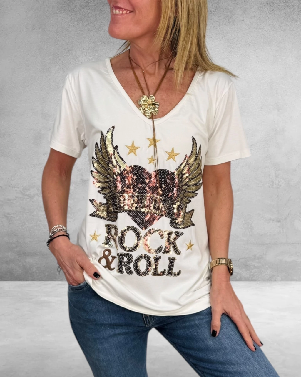 La Remera Rock Rules está confeccionada en una suave mezcla de algodón y viscosa, ofreciendo una sensación liviana y cómoda para el uso diario. Su diseño de escote en V realza la figura, brindando un toque moderno, ideal para cualquier ocasión, ya sea una salida casual o una reunión informal.